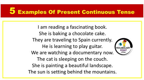 write five examples of present continuous tense. There are any references about write five examples of present continuous tense in here. you can look below.